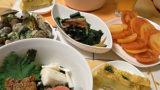 奥のサラダは、蒸しかぼちゃとゆで卵をカラフルペパーでアクセントにしたもの。