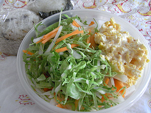 冒頭は、小さなおにぎり2種と、キャベツ、にんじん、大根のミックスサラダ。