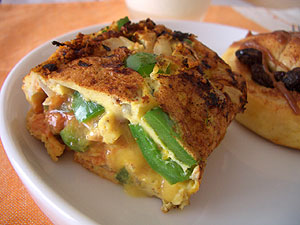 ナツメグで調味した卵2個でとじるというか、大きな厚焼き玉子風にするというか。