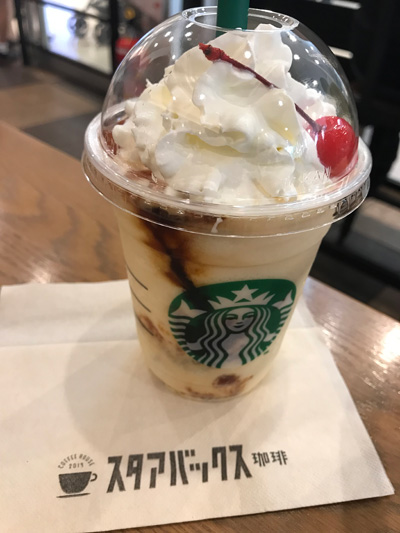 真夏日、がっつりステーキのランチの後、色々補給して気を付けながら都合10キロ15,000歩歩いた締めくくりは、最近レトロ喫茶風のテイストを取り入れた「スタアバックス」でプリンアラモードフラペチーノでした。