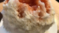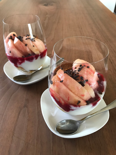 一番下はいただきもののカステラをカットして、その上に自家製ヨーグルト、ラズベリーピューレ、いただきもののイチゴとチョコのバームクーヘンのカット、桃、カカオニブ。一期一会の組み合わせです。