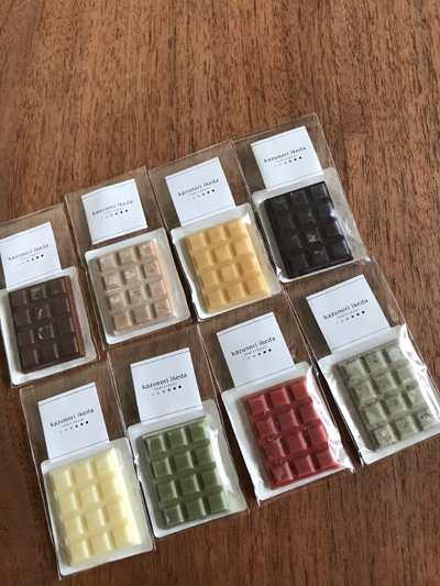 まずは、夏に仙台旅行した時におやつで立ち寄ったカズノリ イケダで、お会計の時に棚の上に並べられていたこの可愛らしいチョコたち。1枚100円という手ごろさも加わり、全種類購入しました。食べ比べという名のデギュスタシオンという商品名、このお買い物は正解でした。