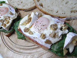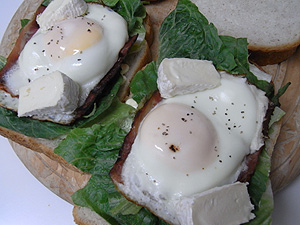 ローメインレタスと、ベーコンエッグと、カマンベールチーズを挟むサンドウィッチ2種。