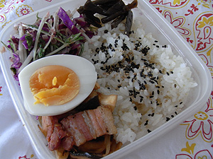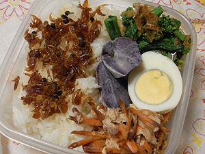 紫キャベツと水菜の和え物とか、蕗の佃煮とか、ゆで卵とか。