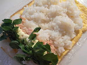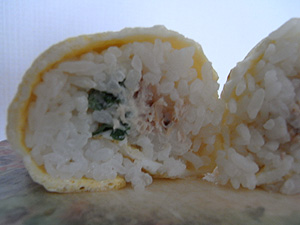 冒頭のは、薄焼き卵を海苔巻きのように巻いた、細長いおにぎりです。