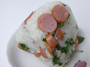 ボイルしたソーセージとフレッシュパセリを混ぜ込んだおにぎり。