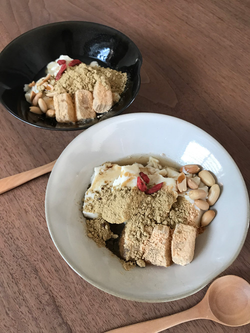 最初は買い出しの際に、最近お気に入りのお豆腐屋さんの濃厚な豆乳を買って試してみました。シロップはあまりに詰めず砂糖も控えめで。トッピングは、千葉県の美味しい落花生とか、クコの実とか、例のきな粉とか。