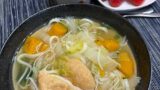 卵焼き機でエノキをオリーブオイルでソテーして、ちょっと醤油を垂らして、卵液を流し込んで他のことをしてだいぶ周りも固まってきたところに、チェダーチーズのスライスを乗せ、また他のことをしていてさらに固まりつつあるのを半分に折りたたんで、1/2ずつにカットしました。カットといっても菜箸でつつつーっと切るので、包丁もまな板も汚さずにちゃちゃっと。