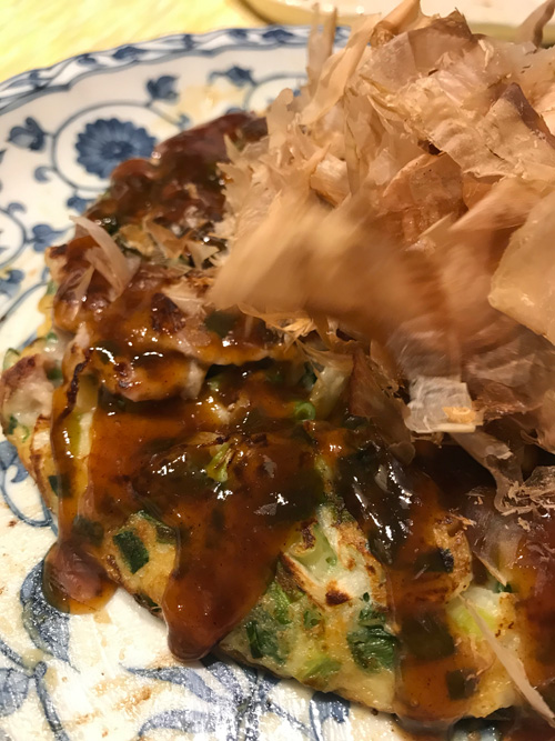 固まるの?というくらいのとろとろの生地でしたが、ちゃんと火が通り固まりました。巨大なふわとろ系のタコ焼きのようで、豚肉を使っていましたが次はタコでも美味しいかもしれないということに。