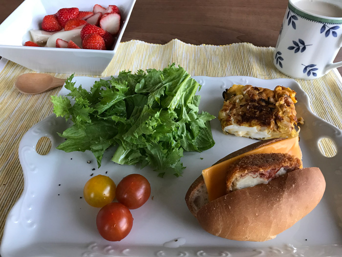 腰塚で購入したコロッケはいったん冷凍していたので、サンドウィッチに。小ぶりだけど半分にカットした方が可愛いかなと思ってもう1個は引き続き冷凍保存中です。半分にした方が早くフライパンでも温まって一石二鳥だったりして。