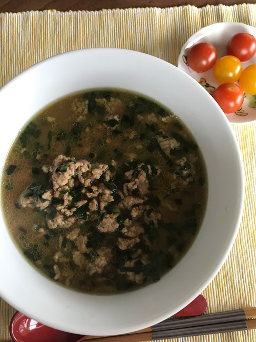 先日買い出しに行った夫が、ラーメンの生麺と、旭川ラーメンのスープを買ってきました。とにかくラーメンを食べたいのだそう。刻んだニラと豚ひき肉を炒めて、スープを入れて煮込み、別途茹でて湯切りした麺と合わせて作ってくれました。休日でないと彼にはお昼を作る余裕がないので、こういう週末もありがたい。