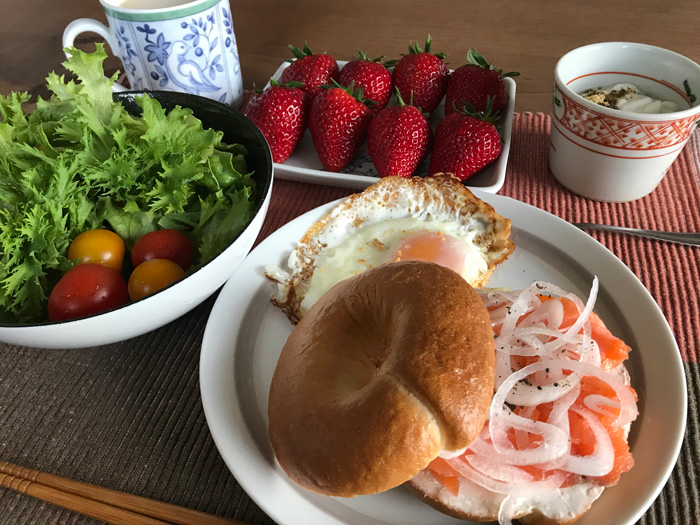 で。スモークサーモンでまず食べたいのは、クリームチーズと一緒にサンドするベーグルサンドです。これは昨日のうちに焼いておいたので、半分にカットして片方にクリームチーズ、もう片方には薄くマヨネーズを塗り、新玉ねぎと一緒に挟みます。ケーパーはなかなか常備できないので、黒胡椒を挽きました。