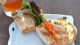 コロッケサンドは片方のパンの内側にはスライスチーズ、もう片方にはお好み焼きのソースを薄く塗ってみました。これも合う。