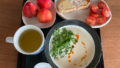 クラシルの捏ねないパンをトーストしている間、ミニトマトやブラウンマッシュルーム入りオムレツシャンツァイトッピングなどをいただきます。