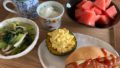 目玉焼きにはこの後塩コショウを振りました。私はパンの時には醤油ではなく、塩コショウ派。豆もやしと豆苗とミニトマトはナムル風。