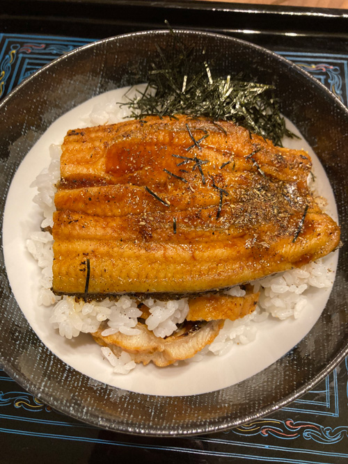 今回はシンプルに鰻を楽しみたいので、前回のように錦糸卵や三つ葉などを乗せません。フライパンにホイルを敷き、鰻の皮目を下にして並べ、酒を振りかけて蒸すという方法でふっくら仕上がります。下半身は刻んで御飯に忍ばせ、上半身は上に乗せてありがたがる、という盛り付けで確定しております。