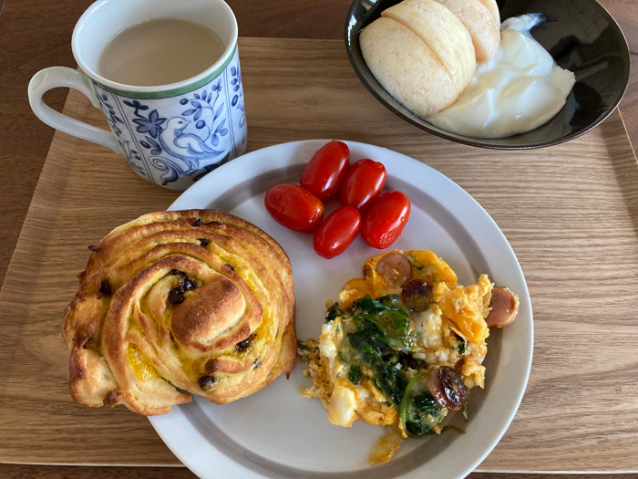 豆苗は1回だけで根っこを廃棄するのは豆苗に失礼な気がするので、必ず水を張って育てています。それをブラウンマッシュルームとともに卵でとじました。