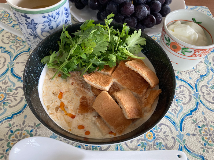 ちょっと久しぶりの鹹豆漿(シェントウジャン)。元気なパクチーに出会った時に作る習わしになりました。