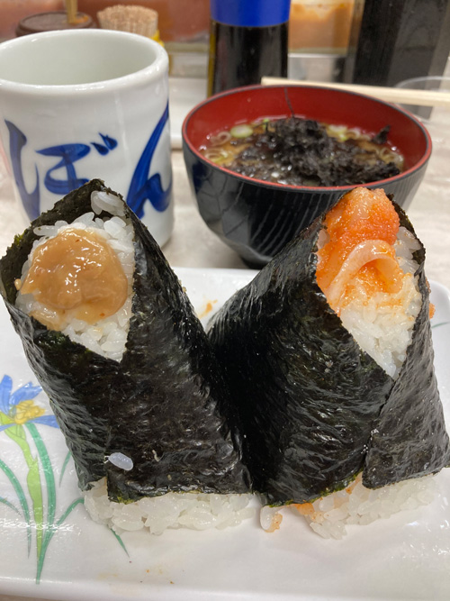 夫は、明太クリームチーズと卵黄醤油漬け、なめこの味噌汁。食べている間、どんどんテイクアウトのお客さんが来店していて、タイミングがちょうどよかったかも。そして注文が聞こえてくるのですが、男性が圧倒的に卵黄醤油漬けを頼んでいるようでした。偶然かもしれないけど、面白かったです。