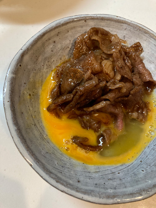 我が家は西日本の出身なので、しょうゆとザラメと一緒に焼き付けて、まずは卵で受けてという形で最初にお肉を味わいます。脂がさらりとしていて後味がよかったです。