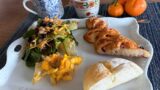 クルミたっぷりフランスパンの在庫がなくなるために、ブリーチーズの購入が間に合いました。温めたパンを半分に割り、そうするとクルミがほろっとこぼれたりもするのですが、チーズを挟んで少し柔らかくなったところを食べるのです。これで完成形です。