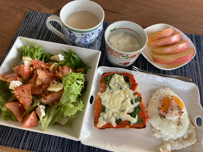 自家製の食パンで、バジルをたくさん散らしてチーズを掛けたトースト。結局また目玉焼きを乗せて食べました。