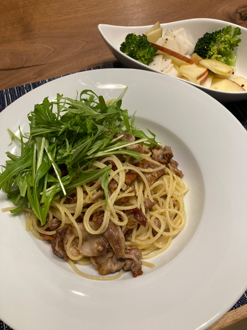 今回はソテーした豚肉と合わせ、水菜をトッピングしてみました。アレンジしてみたかったのですが、いい感じでした。