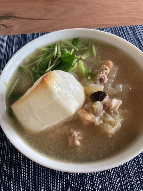 昨日の豚汁に、お餅を焼いて入れました。昼ごはんの準備が楽…!