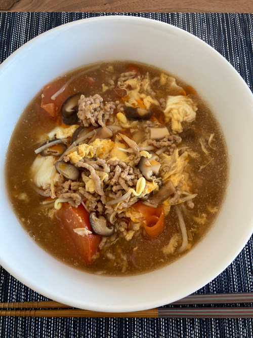 袋入りの生麺タイプの酸辣湯麺を夫が買ってきてくれたので、ちょうど大玉トマトもあるうちにとそれでお昼ご飯にしました。