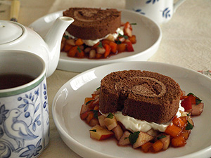 ロールケーキと果物を一緒に味わいます。