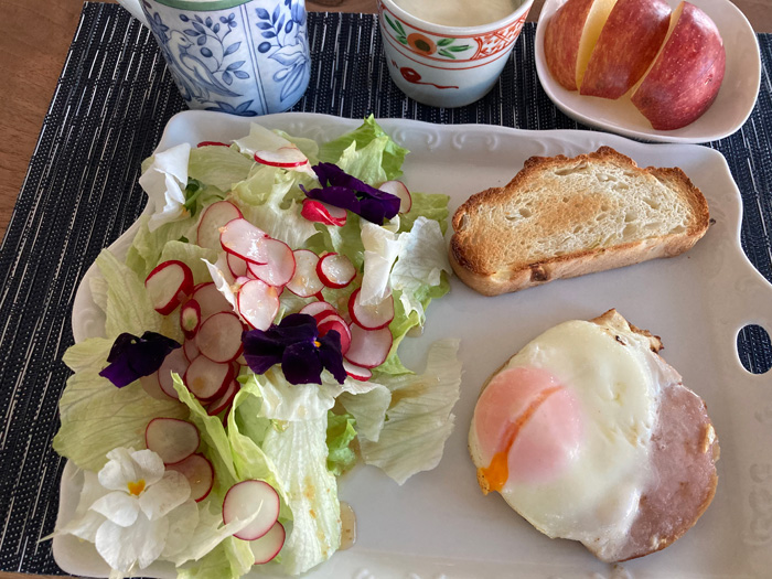 まだまだエディブルフラワーがあるので、花のサラダを食べています。この日はラディッシュもスライスしたのでまた違った配色になりました。