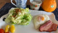 ハムエッグは途中で蓋を落としてしまい、割れてしまったのがかなり悔しいです。四角の卵焼き器に丸いミルクパンの蓋をのせているので、ぴったり合わずこのような事態になりました。