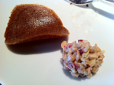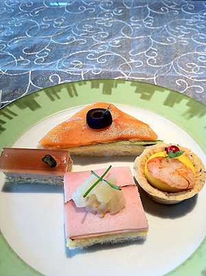 スモークサーモン、卵ときゅうりのオープンサンドウィッチ、黒オリーブ添え、プティタルトに詰めた南瓜のマッシュ 小海老添え、黒胡椒風味のポークハムと林檎のチャツネ マスタード風味、フォアグラのパルフェ 葡萄とロゼシャンパンのジュレ ピスタチオナッツ添え