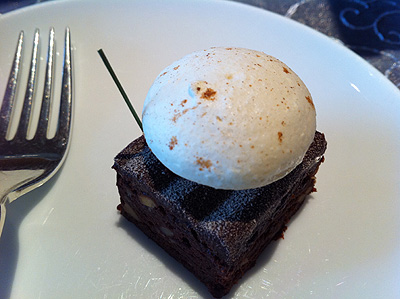 まずは、五香粉のメレンゲを添えたチョコレートブラウニー。