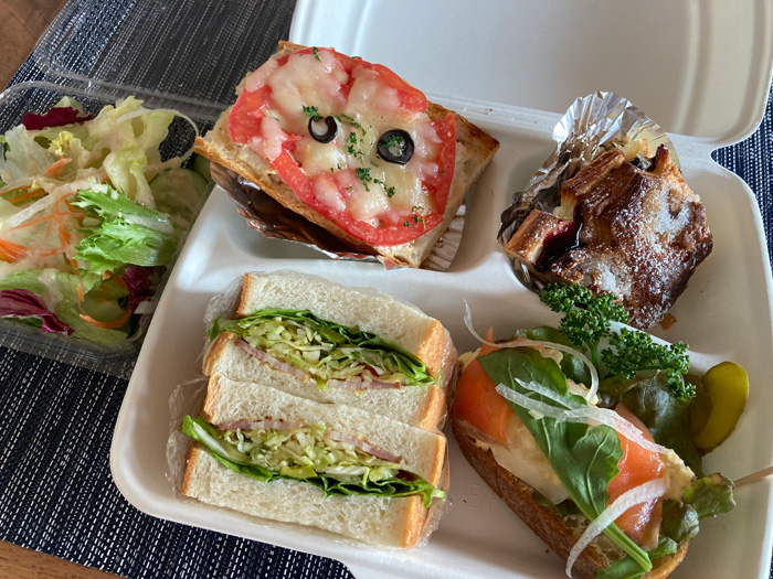 この日は、ミニ極食パンでのベーコンやコールスローのサンドウィッチや、ツナ・トマト・オリーブのバゲットタルティーヌ、カンパーニュには卵サラダやスモークサーモンでタルティーヌ、デザートはクルミアマンドです。