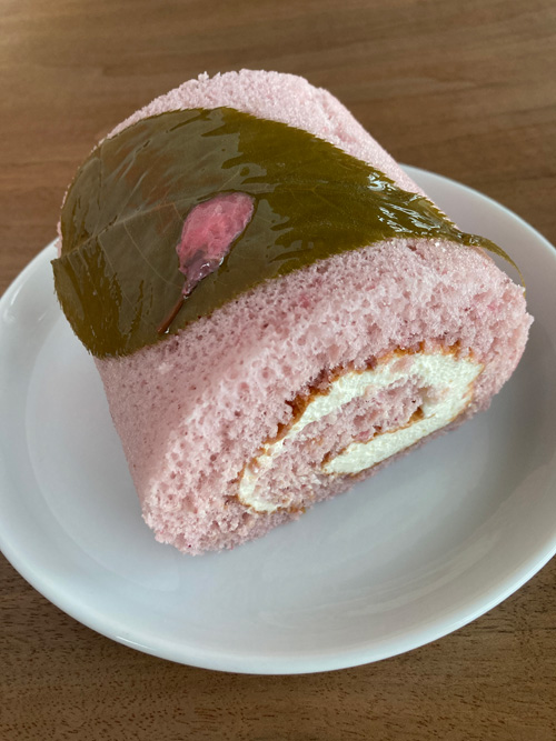 東京:王子「権現坂 ランギャール」(7) 2021.03.28 王子でのケーキはやはりランギャールなので、立ち寄ってみたら季節のロールケーキのこちらのさくらロール1296円が最も輝いて見えました。桜の葉ごと、えいっとナイフで切り分け、余すことなく春の味わいを堪能しました。