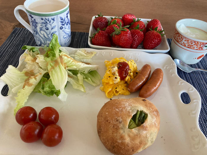 パン旅に刺激されて小松菜を包み込んで焼いたパンで朝食。リベイクしていただきます。