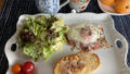 先日のジョンソンヴィルソーセージの改良版。内側の枠に収まるよう端をカットし、=の間の両脇にその端を配置しました。その状態で目玉焼きをいったん作成。バターを塗ったパン、ジョンソンヴィルソーセージ目玉焼き、山盛りキャベツ、カレー粉という感じで構築しました。収まりがよくて今回はいい感じ。うまく収まると、よし!という気持ちになります。
