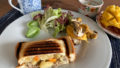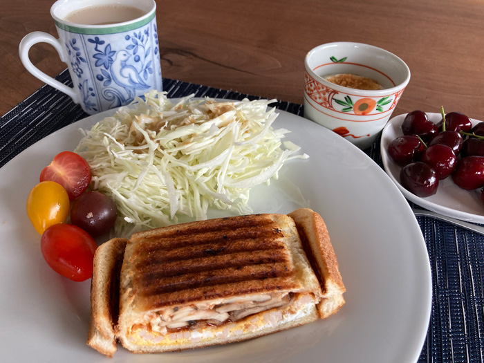 確か、それらのものを入れた気がします。ホットサンドメーカーの片方をフライパン代わりにして、ベーコンを1㎝幅にカットしたものをたまごで閉じ、それと、ケチャップとブラウンマッシュルームをスライスしたのを山盛りにして、黒胡椒を挽いた気がします。