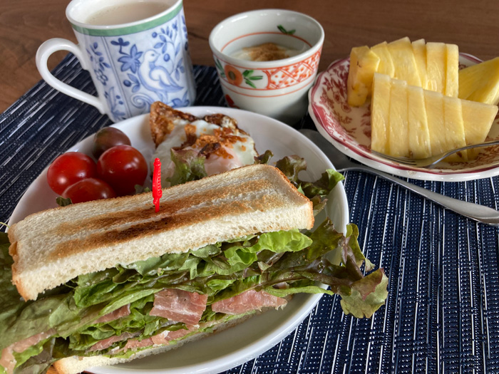 角食をトーストして辛子マヨネーズを塗り、サニーレタスと生ハムを交互にミルフィーユ状に積み重ねてサンドしました。レタスの量が多すぎるかもしれませんが、サラダをパンで食べるということで許してもらおう。