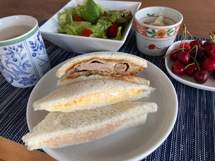 最近朝ウォーキングにハマっている夫が、三角サンドウィッチを買ってきてくれたので、それで朝ごはん。先日のポポーのは4種類買ってかなり満腹だったので、今回は3つにしてもらい、サラダなども用意しました。