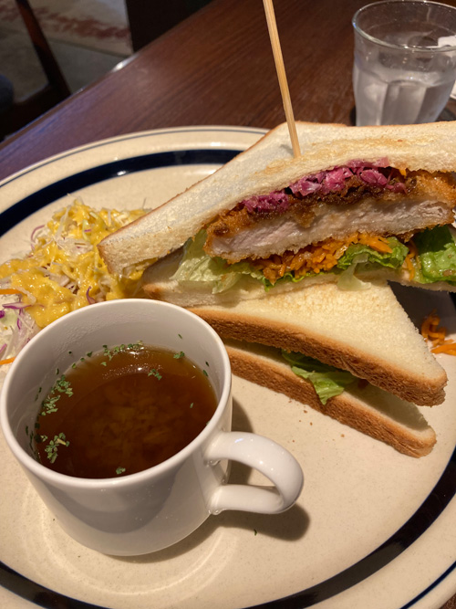 前々から気にはなっていたのですが、『アド街ック天国』の神保町の回で見て、やっぱり行こうと決意しており、やっとお伺いできました。入る直前の看板を見て決めたのは、揚げたてポークカツサンド900円のランチです。