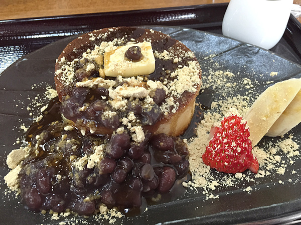 私は柚子のあんみつにしようかなあと思っていたら、厚焼きホットケーキが目に止まりまして、これだねと。