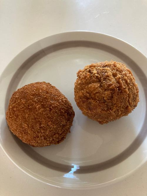 どちらがどちらかが写真ではわからなくなったのですが、メンチカツはとてもジューシーでお肉が感じられて美味しかったです。玉ねぎもごろごろ。実は翌日パンを焼いた後のオーブンに入れて熱々の状態で食べたのでリベイクはバッチリ。