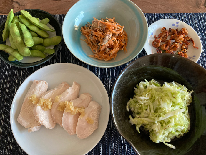 時間があったので、鳥羽シェフのレシピで鶏むね肉のサラダチキンを作りました。以前も作ってみて簡単で美味しかったので、今回は皮をはがして2枚同時に作りました。掛けたのは業務スーパーで購入してハマっている姜葱醤(ジャンツォンジャン)。
