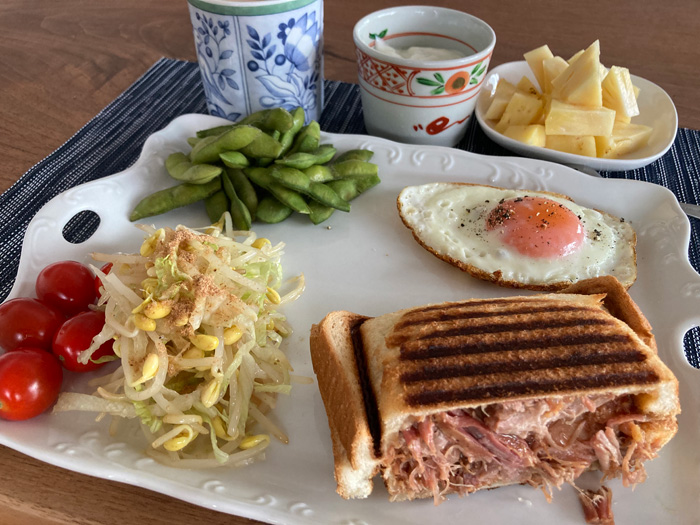 2パック入っていたもう1つをそろそろ使わないとと気になっていたので、今朝はプルドポークでホットサンドにしました。