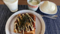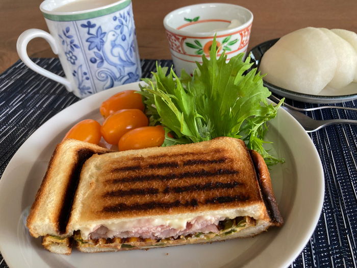 葱入りの薄い卵焼きをホットサンドメーカーの片側で作っておき、ハムやチーズと共にホットサンドにしました。付け合わせの野菜がちょっとやっつけ。