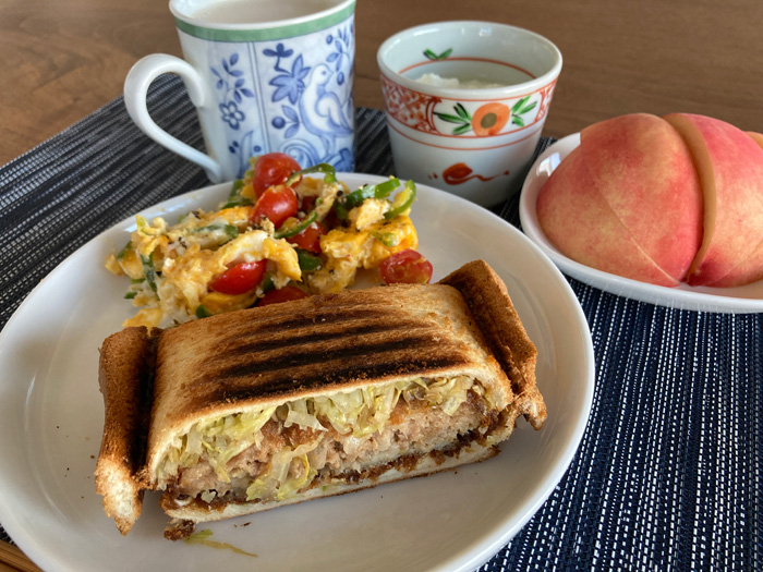 以前、夫がテイクアウトしてきてくれていた上野の大山のコロッケ。冷凍していたこれを使ってホットサンドにしました。大盛りのキャベツとスライスチーズと一緒にサンドしています。コロッケの存在感が凄くて、立派なホットサンドになりました。