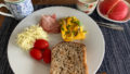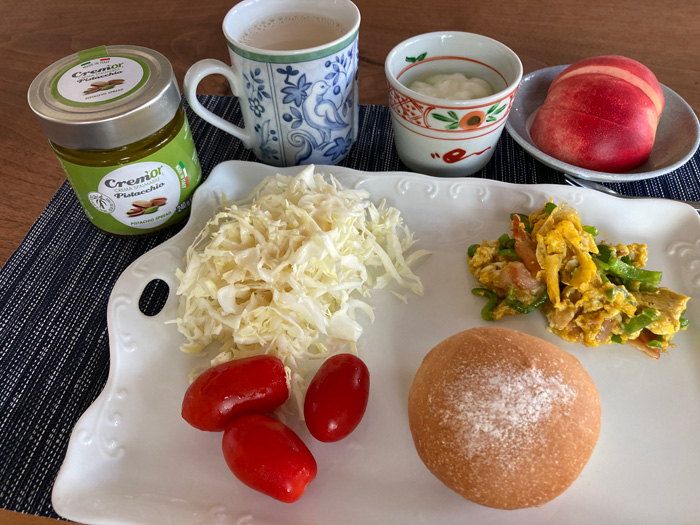 以前から購入していたこのポリコム ピスタチオスプレッドを使うため、シンプルな丸パンを焼きましたのでそれで朝ごはん。本当は食パン的な感じで焼こうとしましたが、同時に焼いたパンの方で型を使ったので丸く成形していました。今から考えるとこれを割って、折角のピスタチオスプレッドを塗った所を写真に撮るべきだったかな。