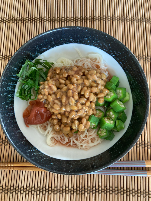 梅風味のオクラ納豆そうめん 2021.08.26 梅風味の麺つゆをいい加減使い切りたいということで、この組み合わせのお昼ご飯になりました。納豆、オクラ、大葉、ダメ押しの梅。全てを私は混ぜてエアリーにした上で食べる派です。そうめんはありがたいことに親戚から送ってもらってる揖保乃糸。